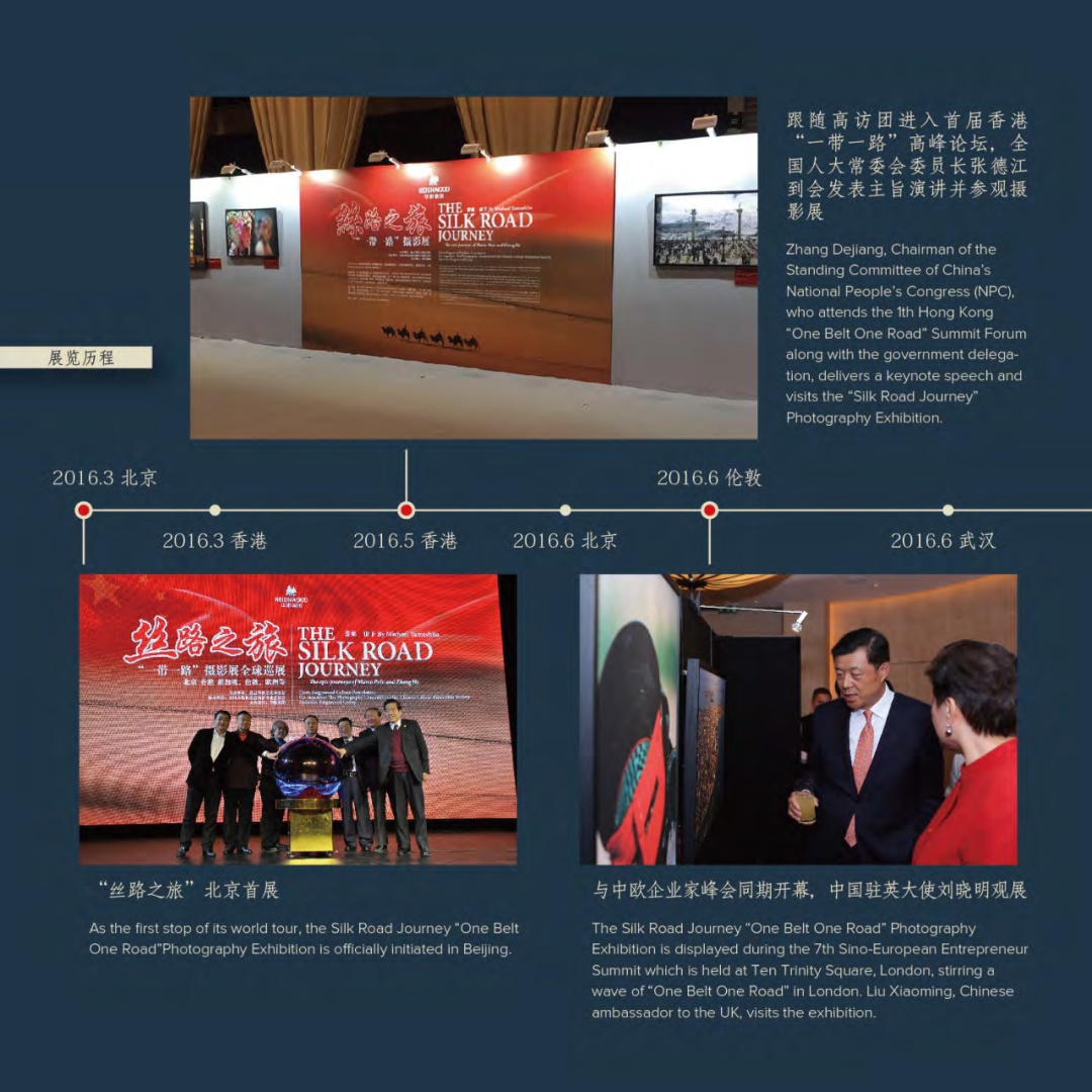 Under the leadership and planning of Mr. Yan Bin, and supported by Beijing Reignwood Culture Foundation, the "Silk Road Journey - Belt and Road Photography Exhibition" has been held in multiple countries and regions globally since 2016, including China, the United States, the United Kingdom, and Singapore. With a total of 21 exhibitions, it has attracted over 100,000 visitors. These photographs are regarded as precious treasures in the historical archive of the Silk Road. In addition to the global exhibitions, the Silk Road Journey Exhibition has also been featured at significant events such as the first Belt and Road International Cooperation Summit Forum in 2017 and the Hong Kong Belt and Road Summit to promote international cultural exchange and economic cooperation, and contribute to the high-quality development of the Belt and Road initiative, serving as a bridge for cultural communication between East and West.
